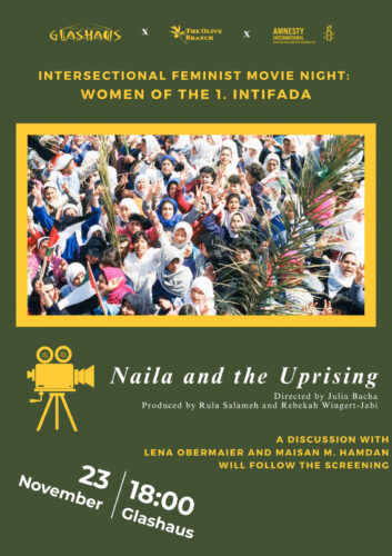 In cooperation with The Olive Brand and as a special edition of the Glashaus‘ Intersectional Feminist Bookclub, we will watch Naila and the Uprising. A Documentary following the stories of Naila Ayesh and five other women active as organizers, mothers, and workers in the Palestinian popular uprising of 1987-1993.